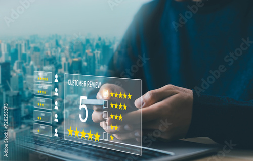 5-star rate review of client, satisfaction survey, best feedback customer, icon happy smile. concept service of the user on a website digital online. experience positive with business top quality