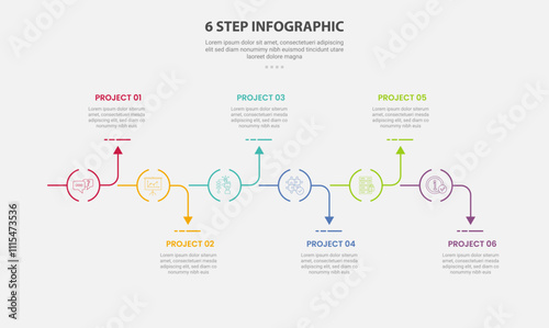 6 points template infographic outline style with 6 point step template with circle and arrow on horizontal line direction for slide presentation