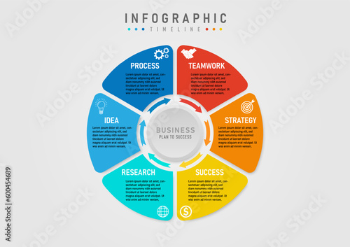 6 step business plan infographic template for success multicolored segmented circle with arrows white icon on colored background In the middle there is a gray button on a gray gradient background.