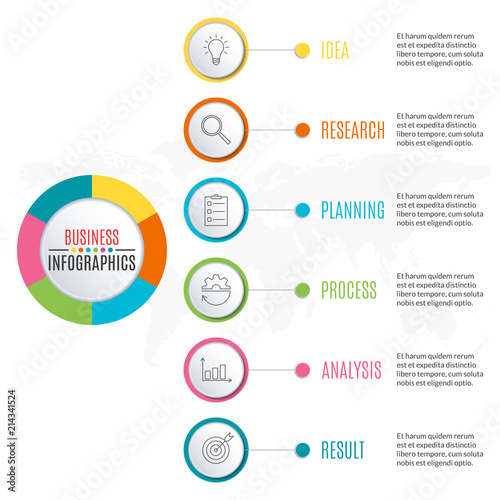 6 steps infographic design. Template for diagram, graph and chart. Timeline design with 6 levels, options, circles. Business presentation concept. Vector illustration.