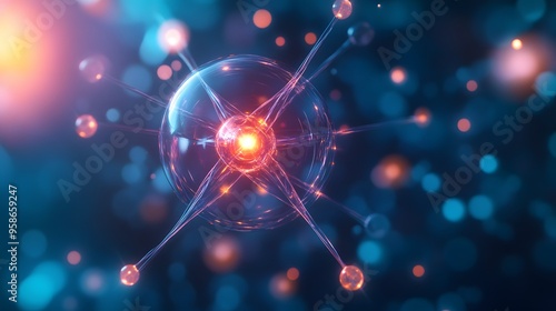 65. Abstract close-up of a central atom in a nutrient molecule with glowing, energetic bonds