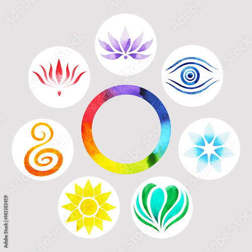 7 color of chakra symbol concept, flower floral, watercolor painting hand drawn icon logo, illustration design sign