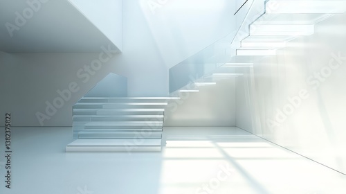 74.A pristine set of white stairs with smooth glass railings, illuminated by soft natural light, showcasing a minimalist aesthetic in a modern architectural space.