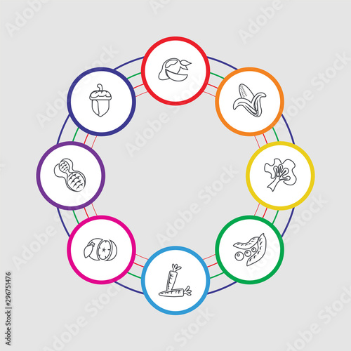 8 colorful stroke icons set included acorn, peanut, orange, carrot, peas, broccoli, corn, mango