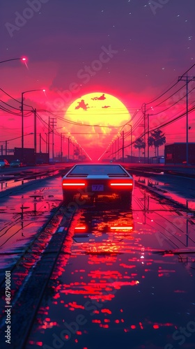80s retro illustration of a car driving with sunset view, exuding synthwave 80s vibes