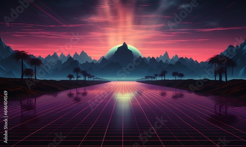 80s retro scene with solarizing master style, desert waves, horizon, god rays, cypherpunk