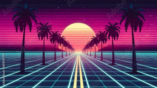 80s synthwave with neon lights, palm trees, grid-lined road, glowing horizon, retro sun, starry sky