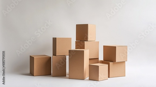 88.Several stacked cardboard boxes, arranged in a balanced formation against a plain white background. The boxes have smooth, brown surfaces with crisp edges, conveying a sense of order and