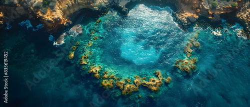 8k, Top view widescreen of Seascape The wonders of the Galapagos ecosystem, A tropical underwater scene with fish, coral reefs, and a diver in the blue ocean