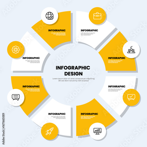 8-section circle infographic design with business icons. Yellow and white pie chart.
