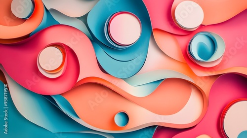 93. "An abstract paper cut composition of swirling circles and layered shapes with a vibrant, soft-focus backdrop