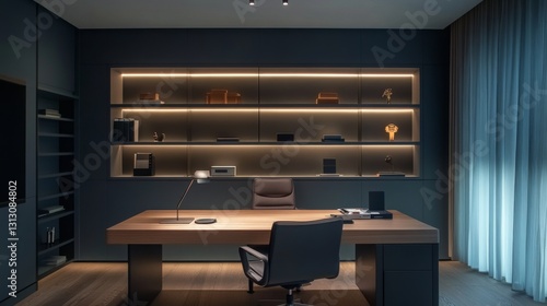 94.A minimalist home office with a wooden desk, an ergonomic chair, and simple shelves on a dark gray wall, with soft lighting adding depth and warmth to the design.
