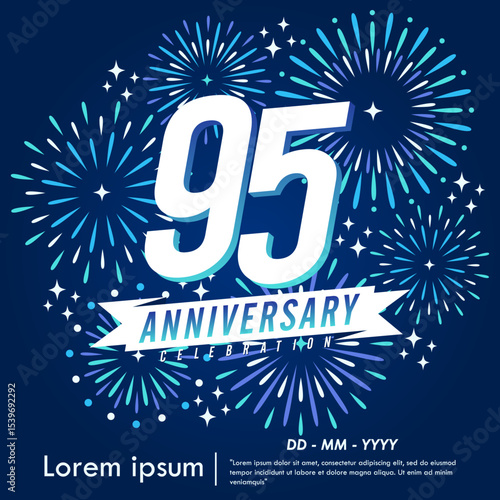 95th years anniversary celebration emblem. congratulations anniversary logo isolated with ribbon and fireworks sparkle on blue background. vector illustration template design for web
