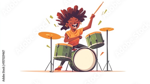 a 2D cartoon illustration of a person doing a drum solo, intense and dynamic, white background--ar 16:9
