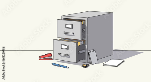 A 2D vector illustration of a modern filing cabinet with open drawers. This image is ideal for concepts of office organization, data management, and business documents.