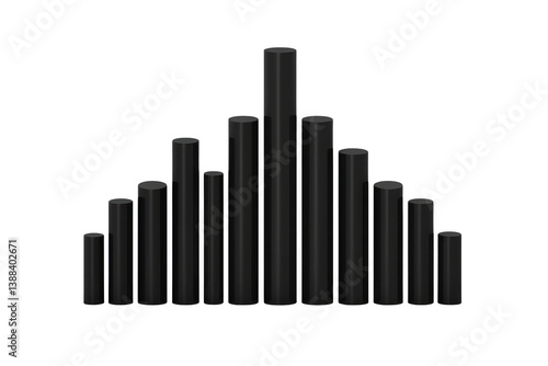 A 3D bar graph with varying heights represents data distribution, showcasing central peak and symmetrical bars on either side, illustrating bell curve