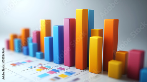 A 3D business bar graph with an upward arrow illustrates financial growth and market success