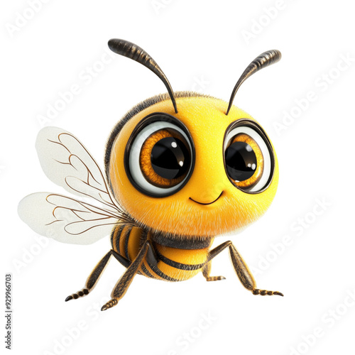 A 3D cartoon, a happy, cute bee with big eyes on a white background, realistic rendering on a transparent background