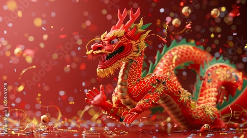 A 3D Chinese New Year card featuring a dragon tangling around 2024 on a red background with gold confetti decorations. Text reads: Dragon brings prosperity.