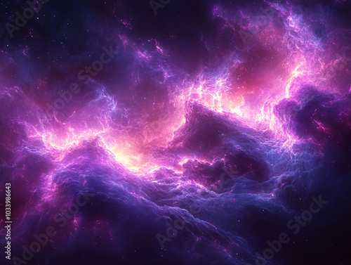 a 3D digital art of a cosmic lightning nebula in space. The nebula is composed of pink and purple colors and has a starburst pattern.