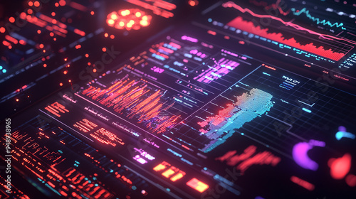 A 3D financial dashboard with glowing real-time data, symbolizing the power of analytics in driving informed financial decisions and strategies