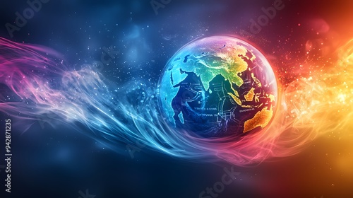 A 3D globe with a colorful map. Ethereal swirls in blue, pink, and gold surround it, creating a cosmic atmosphere. The background appears solid.