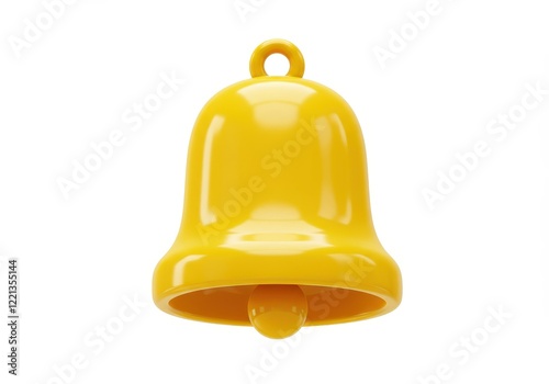 A 3D glossy yellow bell with a smooth surface, a round clapper inside and a small loop at the top for hanging isolated on white background