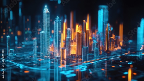 A 3D holographic property market graph in a futuristic setting, indicating real estate growth.