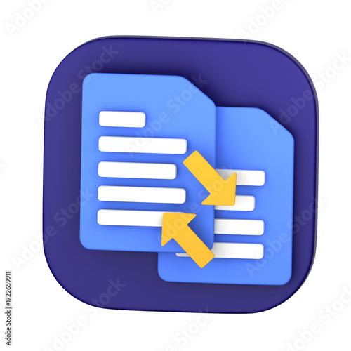 A 3D icon depicts two overlapping documents, showcasing a transfer or merge of data. The vibrant blue and yellow elements create a modern, user-friendly design for a digital interface.