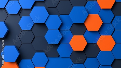 A 3D illustration featuring a minimalist design of geometric shapes in blue and orange, forming an abstract hexagon pattern background.