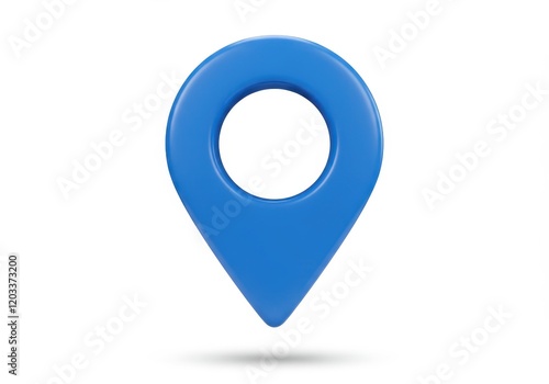 A 3D illustration of a glossy blue location pin with a hollow center floating against a white background