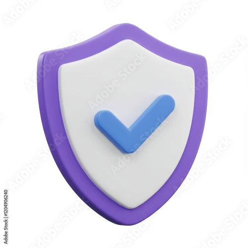 A 3D illustration of a purple and white shield with a prominent blue checkmark in the center isolated on a white background