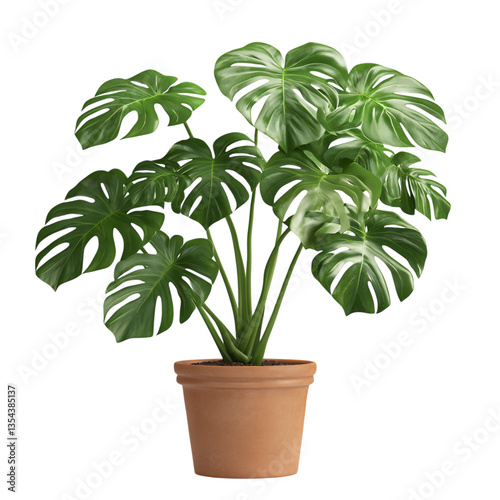 A 3D Monstera Plant with Glossy Split Leaves in a Pot Isolated on Transparent Background