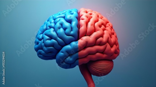 A 3D Render of a Human Brain Divided into Two Hemispheres, One Blue and One Red, Against a Blue Background