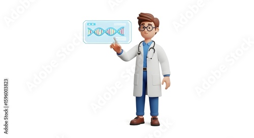 A 3D rendered cartoon doctor pointing at a holographic DNA model, illustrating genetic science.