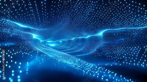 A 3D rendering of a blue futuristic space features an abstract background with a series of connected dots and lines