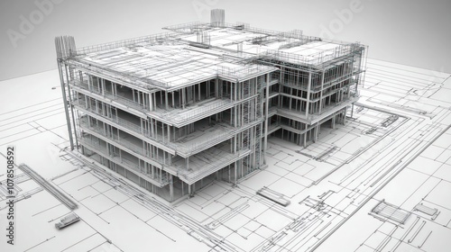 A 3D rendering of a building under construction, shown as a wireframe model, with blueprints underneath.