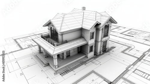 A 3D rendering of a house on a blueprint, with the lines of the house slightly raised above the blueprint.