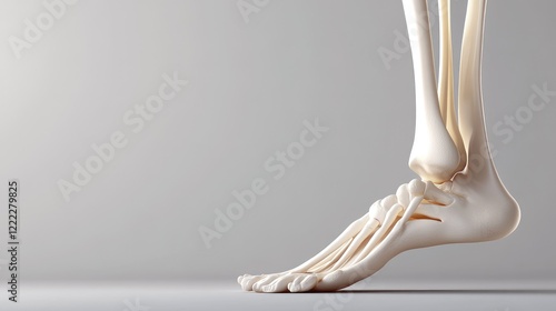 A 3D rendering of a human foot bone with visible structural details and ample copy space.