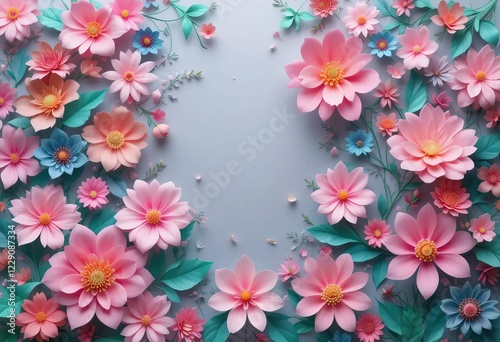 A 3D rendering of colorful paper flowers and leaves on a mint background