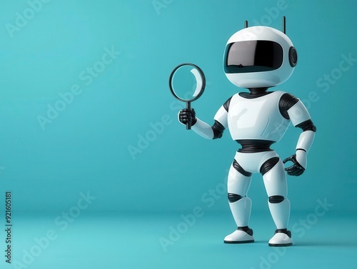 A 3D search engine robot holding a magnifying glass, scanning a digital landscape, symbolizing intelligent search