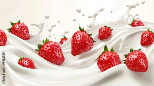 A 3D vector illustration of a ripe strawberry in a splash of milk cream or yogurt drink, with a dessert swirl featuring berries. The scene shows a realistic wave of white liquid, dairy yogurt, or cock