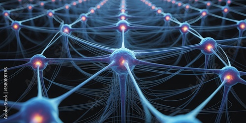 A 3D visualization of an artificial neural network. Blue neurons with glowing orange cores interconnected in a vast grid