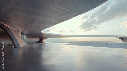 A 3D visualization of modern, futuristic design featuring a bare cement surface, designed for showcasing vehicles.