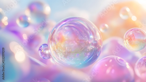 A 3D wallpaper of transparent glass orbs floating in space, refracting gradient pastel colors. Light flows through the glass creating prism effects with soft rainbow hues. The background fades into a