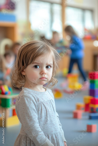 A 3-year-old Caucasian girl standing apart in a kindergarten classroom, looking confused and shy, as other children play together in the background with colorful toys.