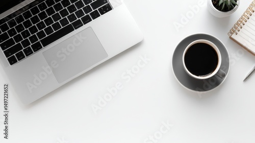 A 4K photo of minimalist Workspace with Laptop, Notebook, and Coffee on white background.