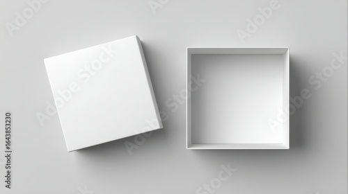 A 4K photo of open blank white square box with lid on a light gray background for packaging, storage, or gift presentation purposes.