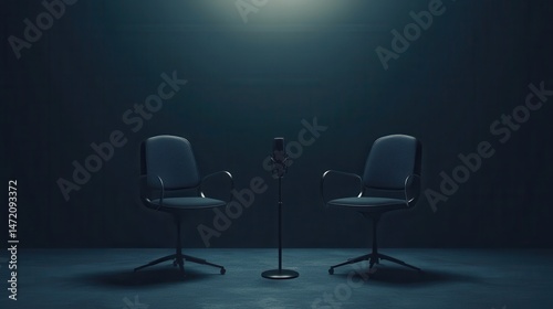 A 4K photo of two chairs and microphones in podcast or interview room isolated on dark background as a wide banner for media conversations or podcast streamers concepts with.