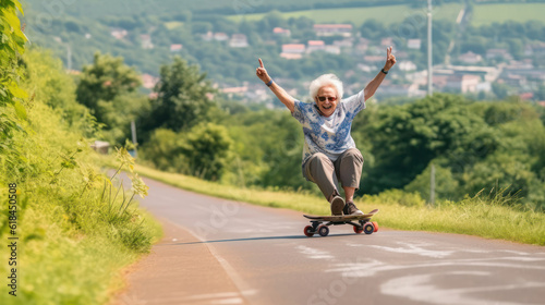 A 70-year-old woman wearing a helmet and kneepads is riding a sk